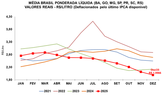 – O preço do leite ao produtor captado em dezembro/25 caiu pelo nono mês consecutivo, fechando a R$ 1,9966/litro na Média Brasil – quedas de 5,78% frente a novembro/25 e de 25,79% sobre dezembro/24, em termos reais (valores deflacionados pelo IPCA de dezembro/25). Com o resultado, a desvalorização real acumulada em 2025 foi de 25,8%. A média anual, de R$ 2,5617/litro, ficou 6,8% abaixo da de 2024.